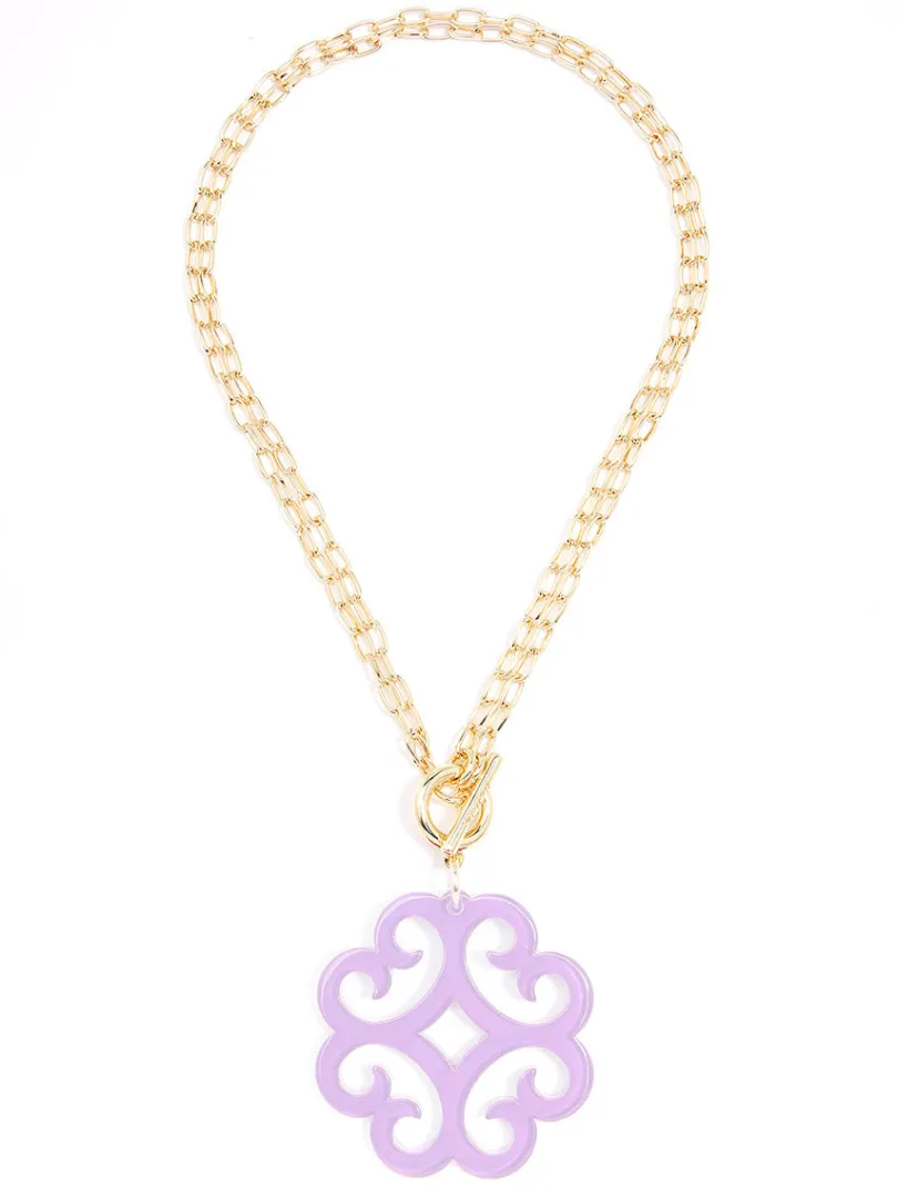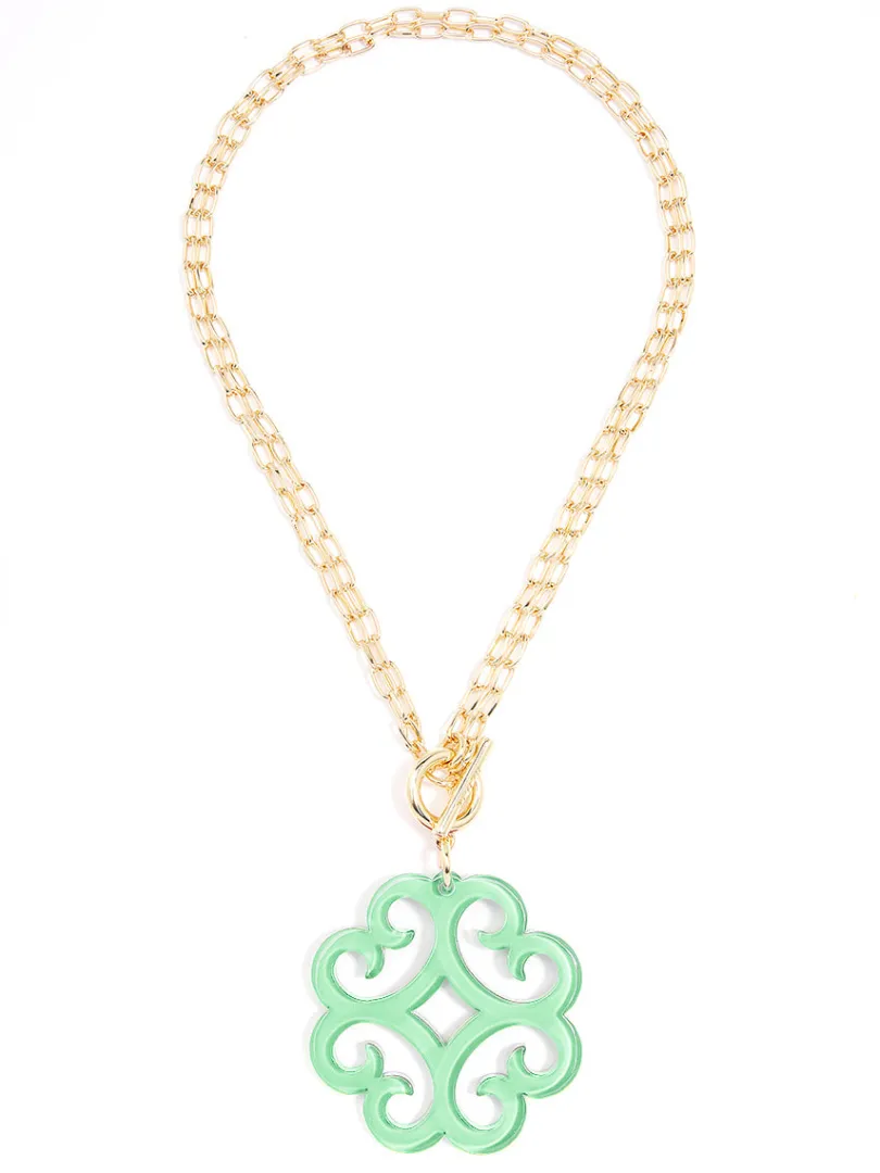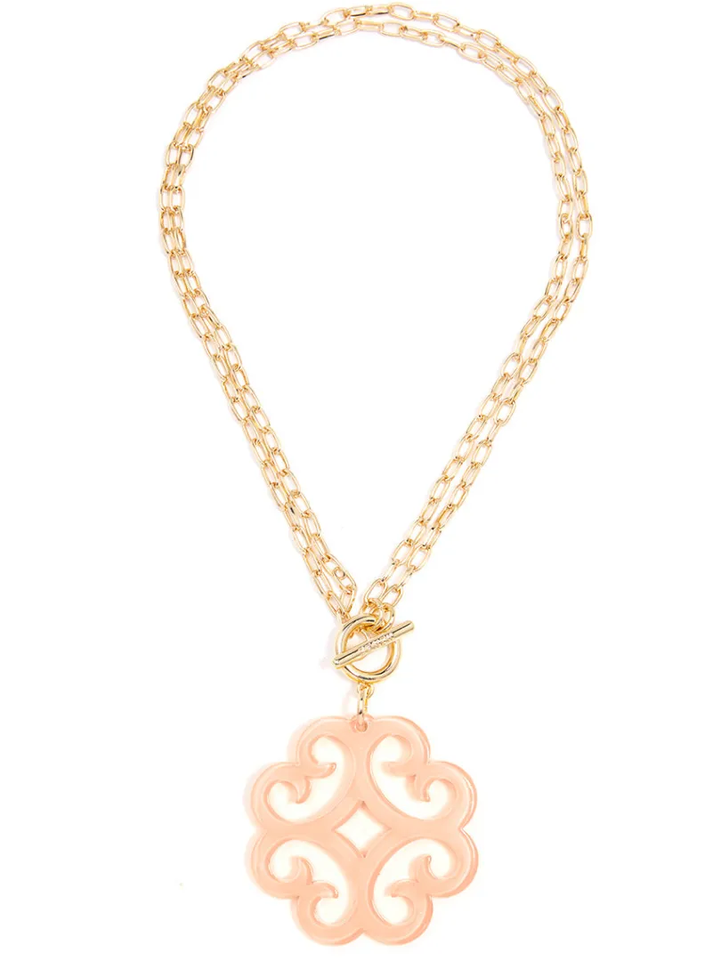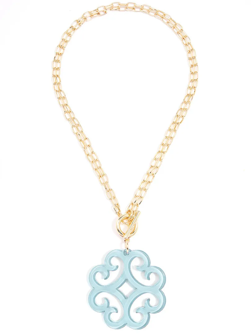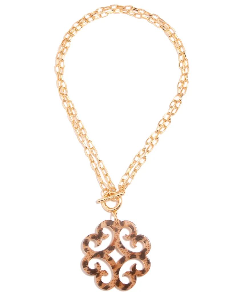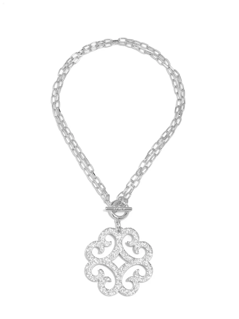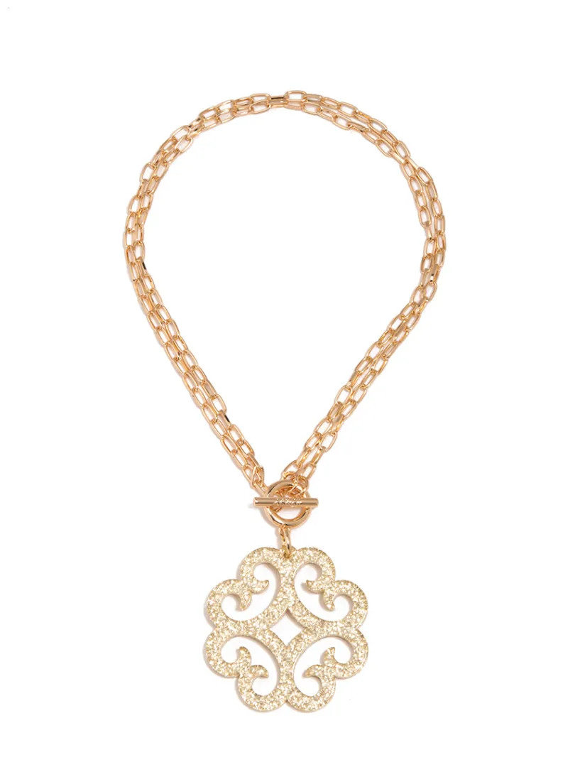 A double chain necklace with double the charm. We designed it with a circular wave pendant for extra flair.