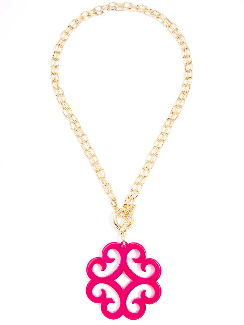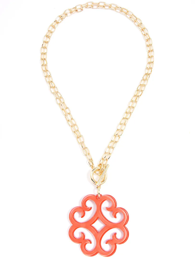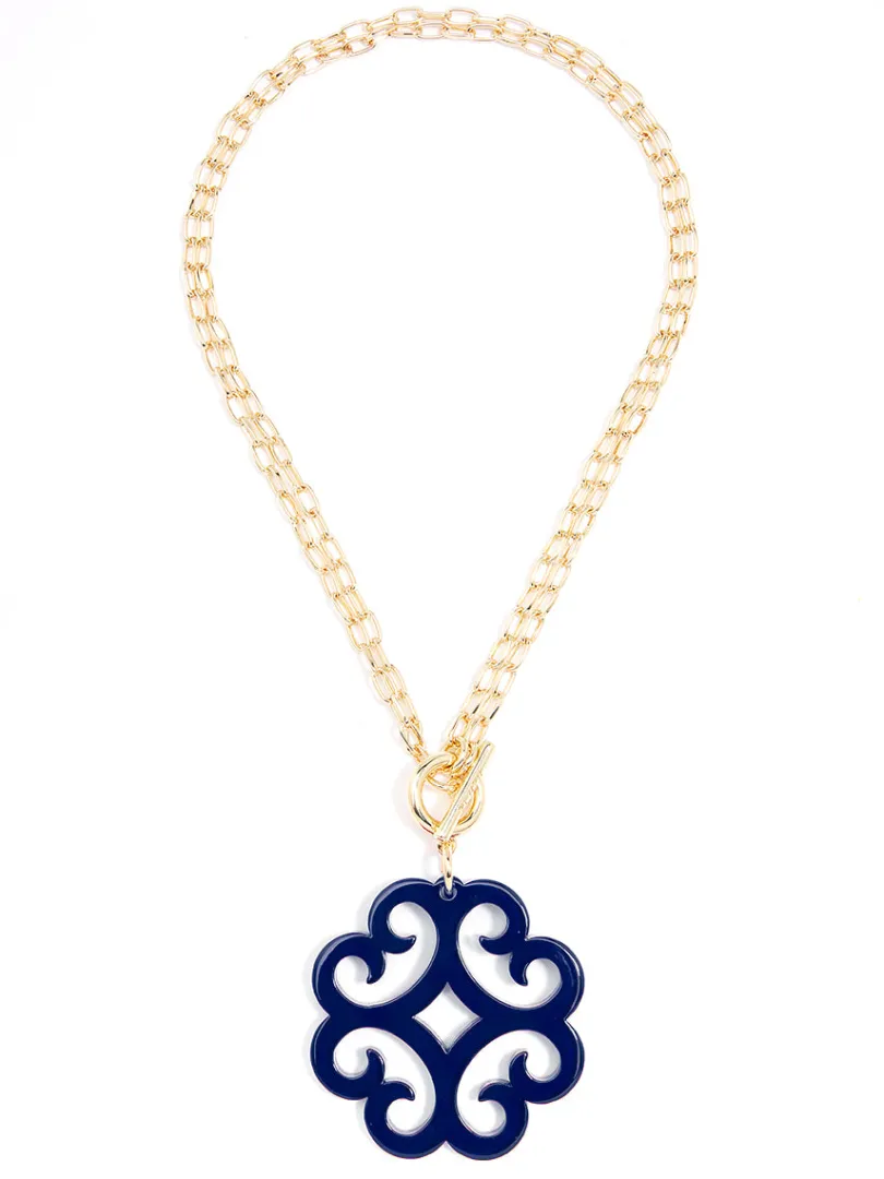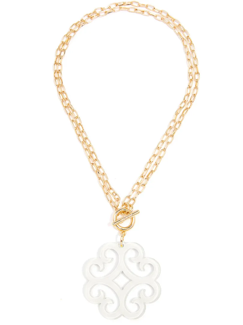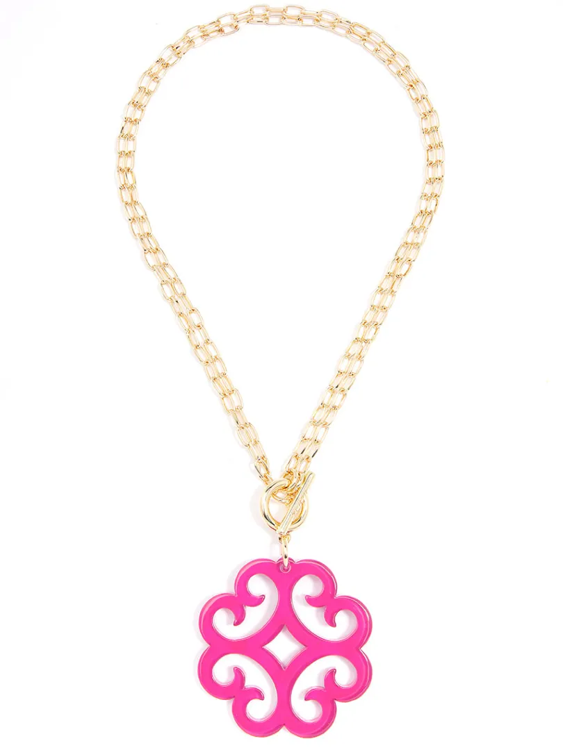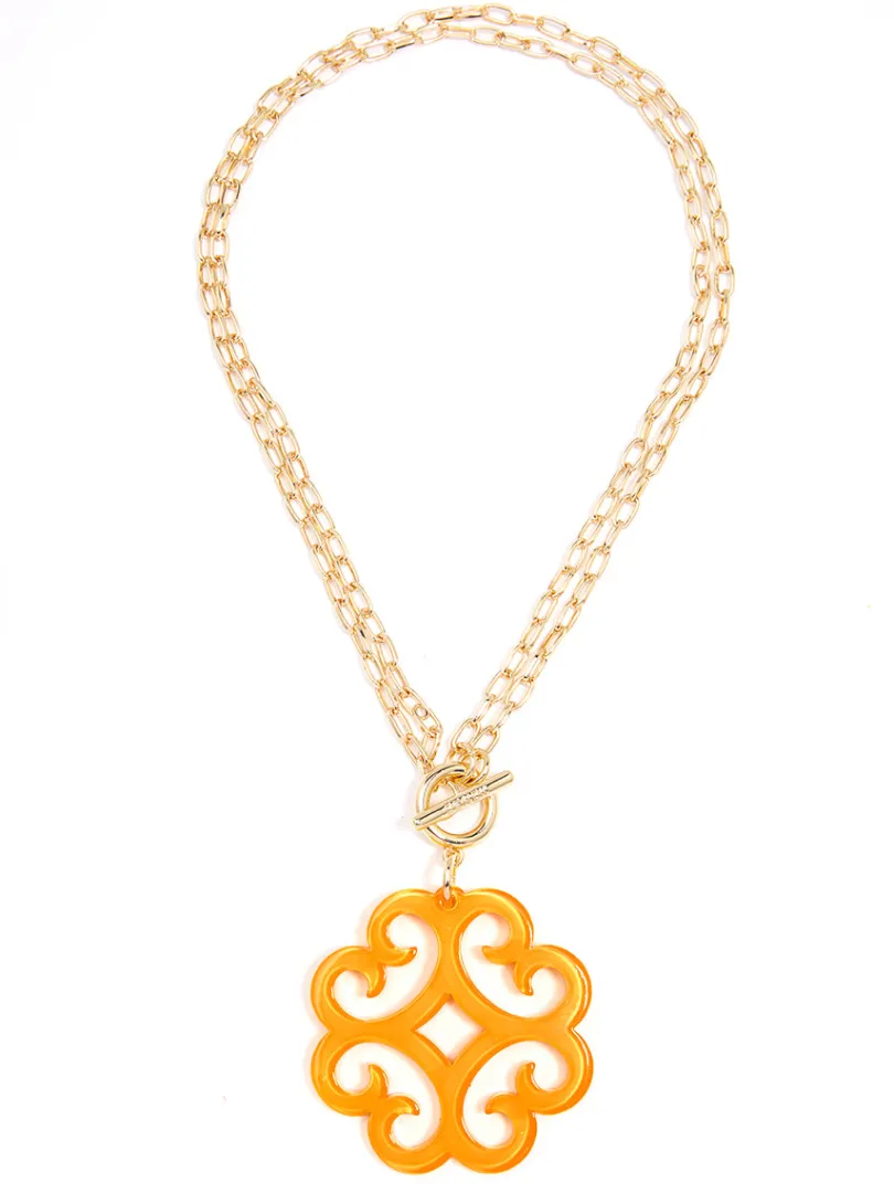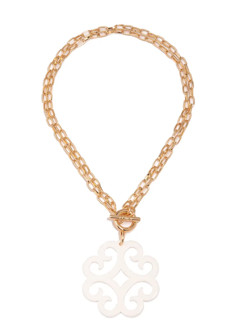 A double chain necklace with double the charm. We designed it with a circular wave pendant for extra flair.