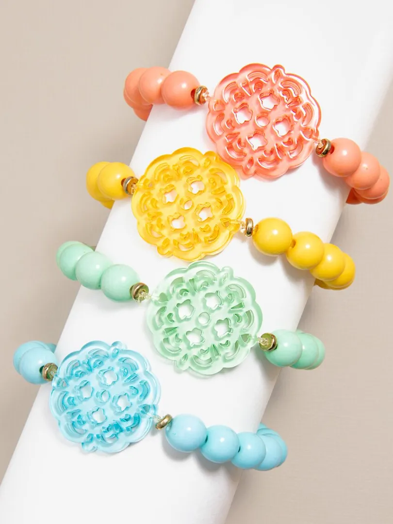 Add some fun pops of color to your arm candy with this bracelet! This beaded bracelet features a premium grade resin pendant charm, with subtle gold-tone accents.