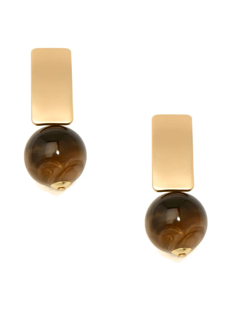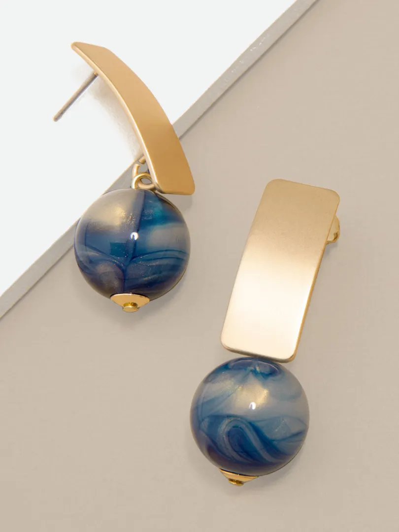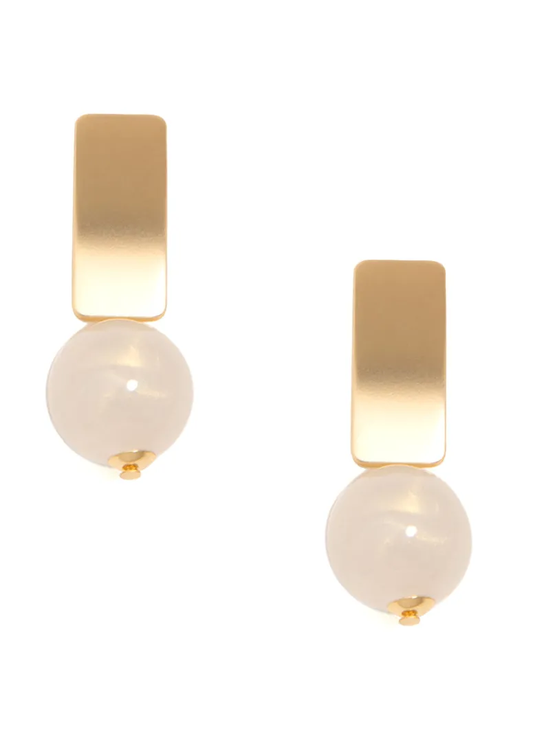 The Iris drop earring is a simple silhouette with a glint of glamour flawlessly composed of a matte metal bar drop and iridescent bead.