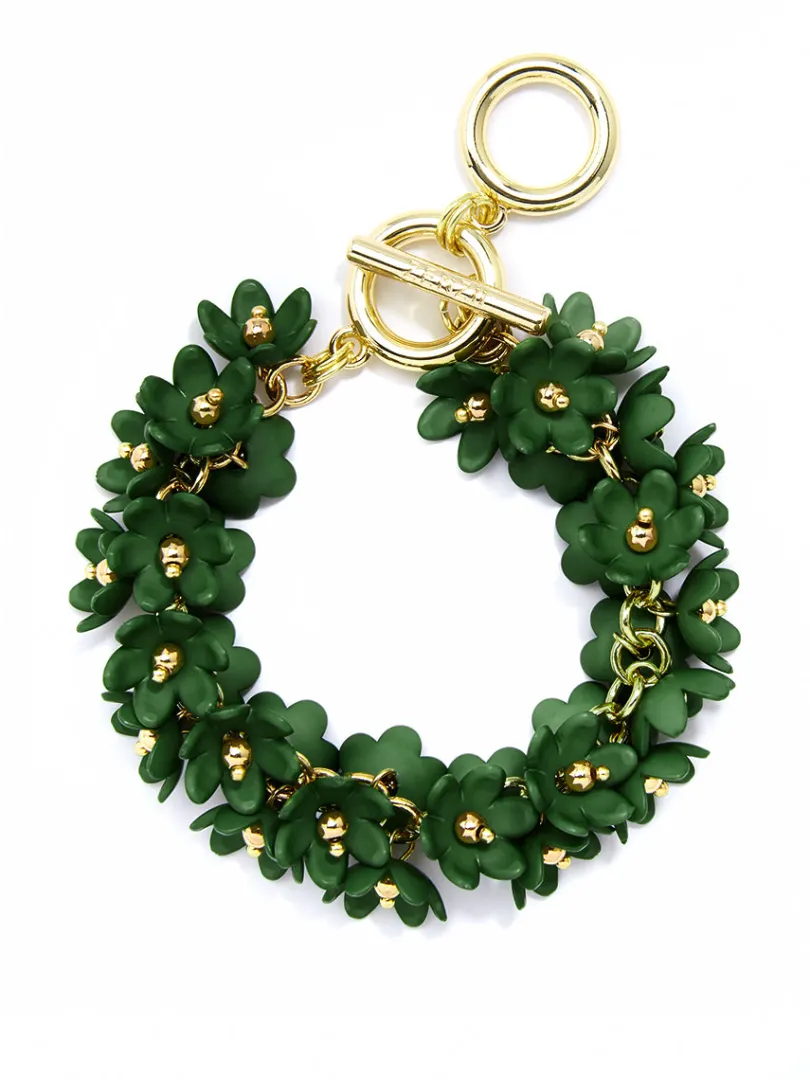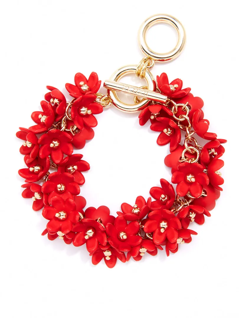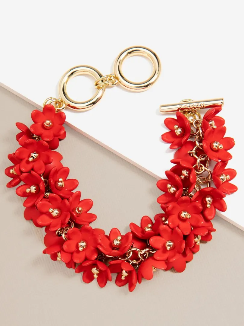 Add some sass to your arm candy with this floral bracelet! This style features a gold-tone chain bracelet embellished with clusters of small, matte-finished resin flowers. It’s the perfect addition to any summertime wardrobe.